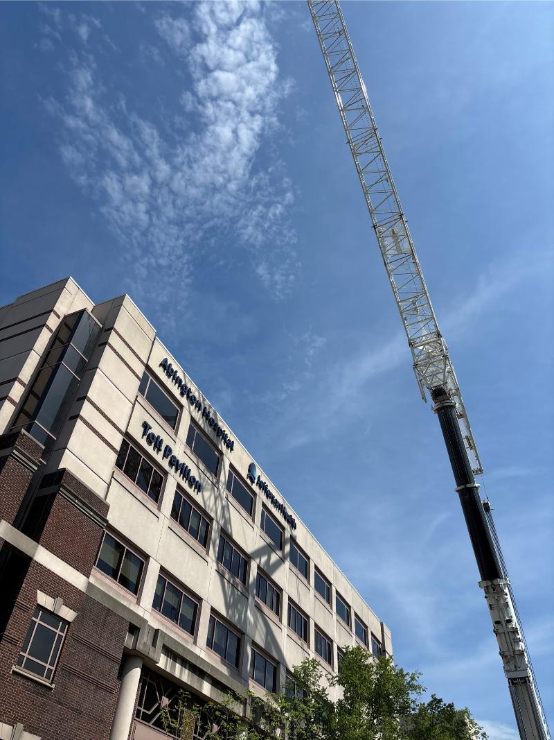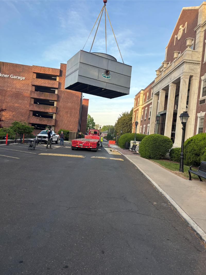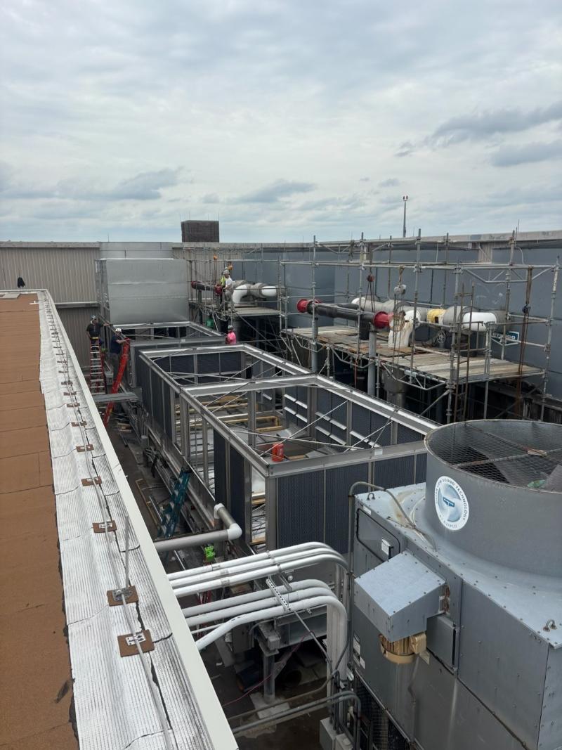 The team executed a phased cooling-tower replacement while keeping the hospital’s chilled-water system online 24/7. Early work pushed through roof-level ice and snow in sub-freezing conditions, with demolition performed by hand—piece by piece—to minimize crane time and risk. An ultra-tight site constrained the 500-ton crane pad and trucking routes directly in front of the Emergency Department, requiring continuous public access and meticulous traffic control. With the towers beside the helipad, real-time coordination with flight and EMS crews ensured uninterrupted helicopter transport for patients. Operations ran around the clock: crane setup Friday night; all lifts completed through Saturday day and night ahead of an approaching rain/lightning front; and full disassembly/demobilization on Sunday. Materials and debris were routed via freight elevators and carefully sequenced through active corridors to avoid impacts to food services, cleaning, linens, and patient care. Through precision planning and choreography, the new towers were set, connected, and ready for commissioning within a narrow pre-cooling-season window.